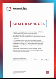 «Выражаем благодарность коллективу UPdesign и лично директору студии Евгению Алтапову за проделанную работу по созданию и изготовлению имиджевого каталога для Уральского банка Реконструкции и Развития. В «UPdesign» профессионально подошли к решению поставленной задачи. Проактивная позиция дизайнеров, понимание потребностей и целей заказчика позволили создать уникальный, стильный и оригинальный каталог для УБРиР. Благодарим за выполненную работу, желаем студии качественного роста и творческих успехов! Будем рады дальнейшему сотрудничеству»
